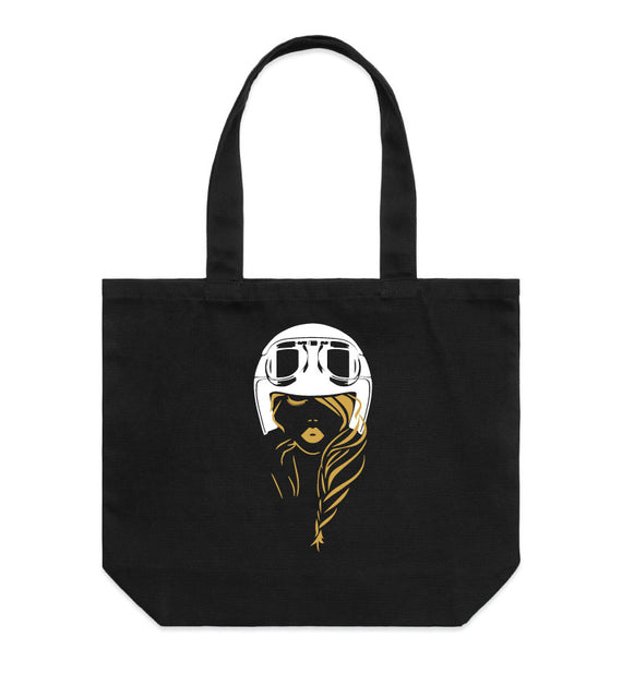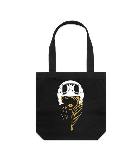 Timeless, elegant and very demure, this lady rider wearing a motorbike helmet looks great on anything. Constructed from sturdy, thick cotton with extended straps and a spacious main compartment, this tote is perfect for, well, everything! With reinforced shoulder straps and a heavy weight of 320 GSM, it's also made from 100% cotton canvas. Available in two sizes.