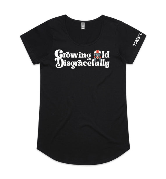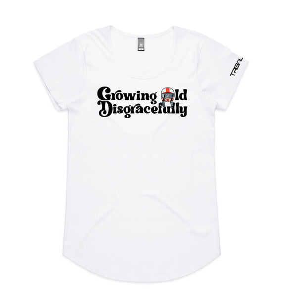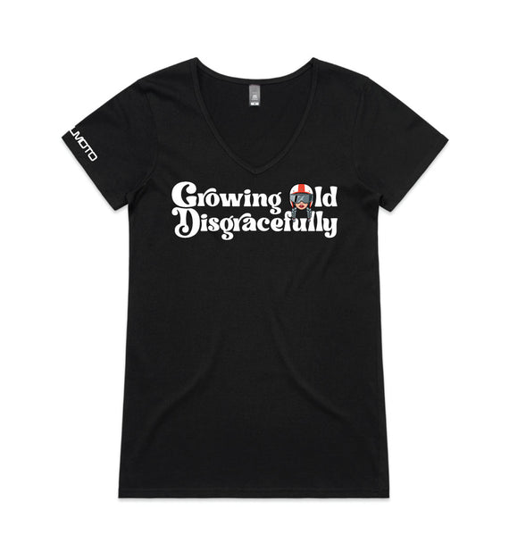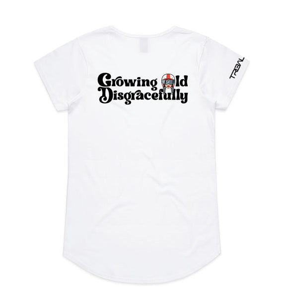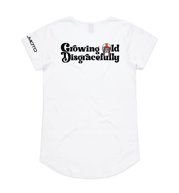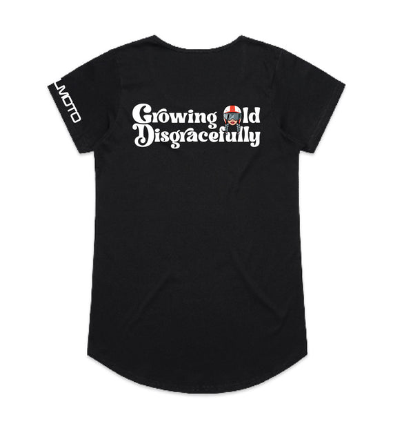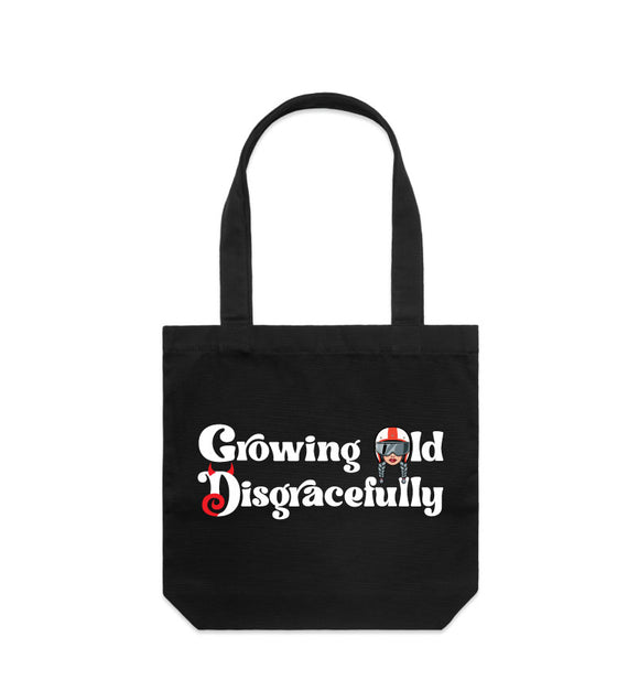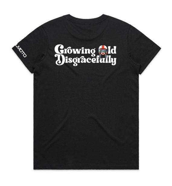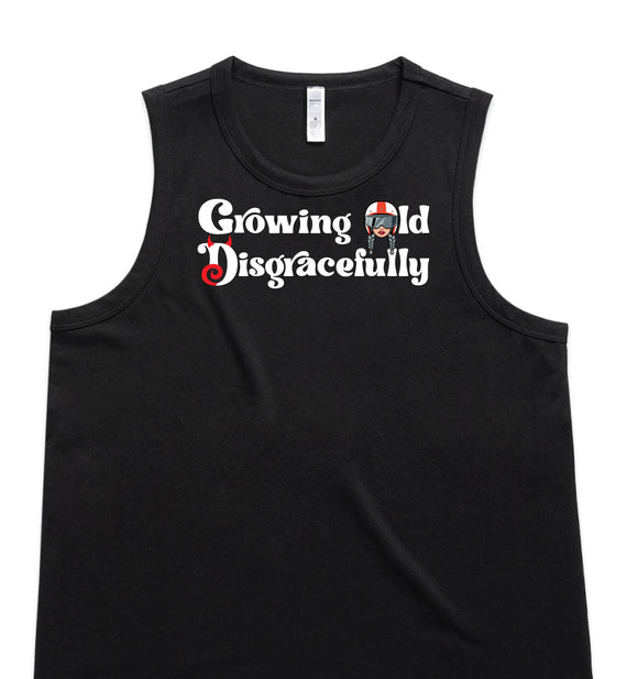 This striking design includes the words Growing Old Disgracefully with a lady in a motorcycle helmet with grey plaits. Comes in 2 options, helmet only, or helmet and devil horns and a tail. Design is available on a variety of products, including: singlets / tanks, tees (v-neck/scoop neck - round neck), long sleeved tees / sweatshirts / hoodies, tote bags and stickers/decals.