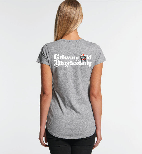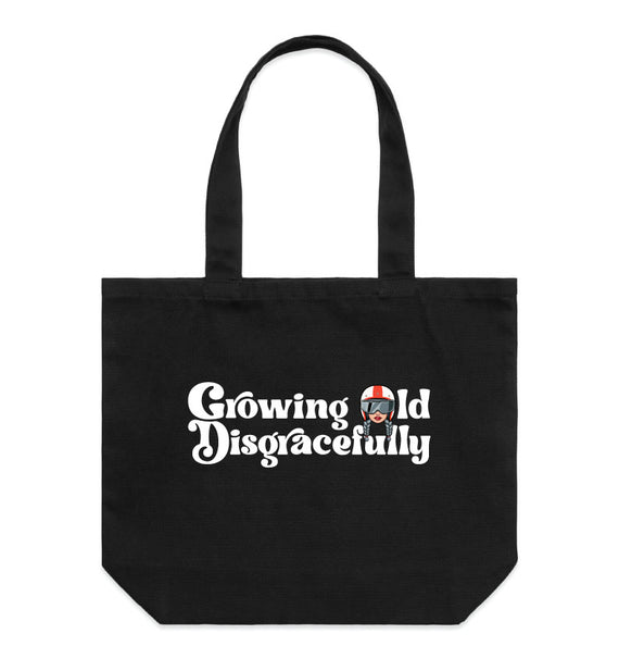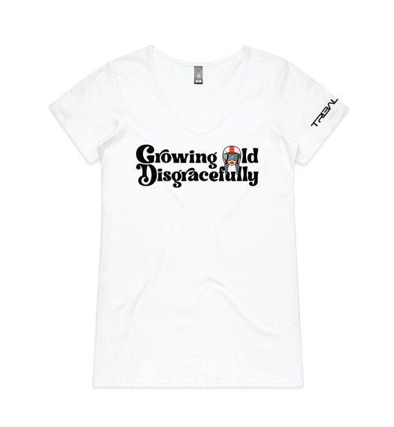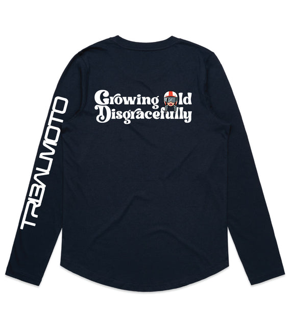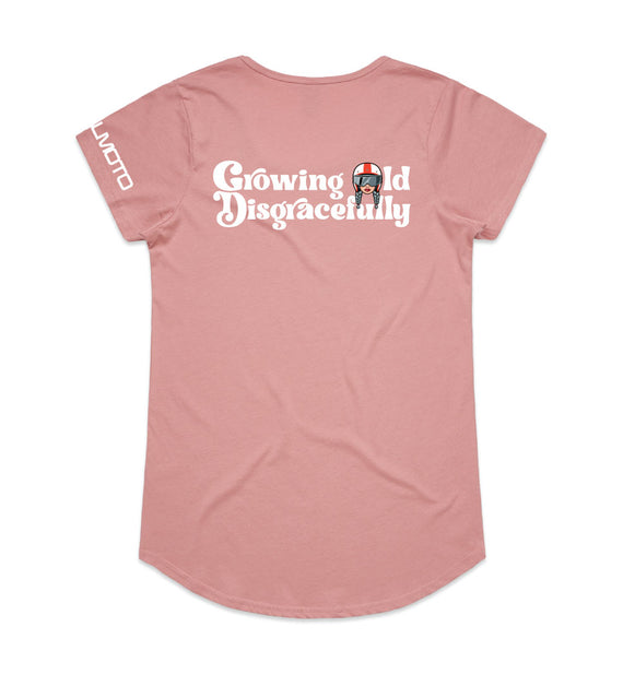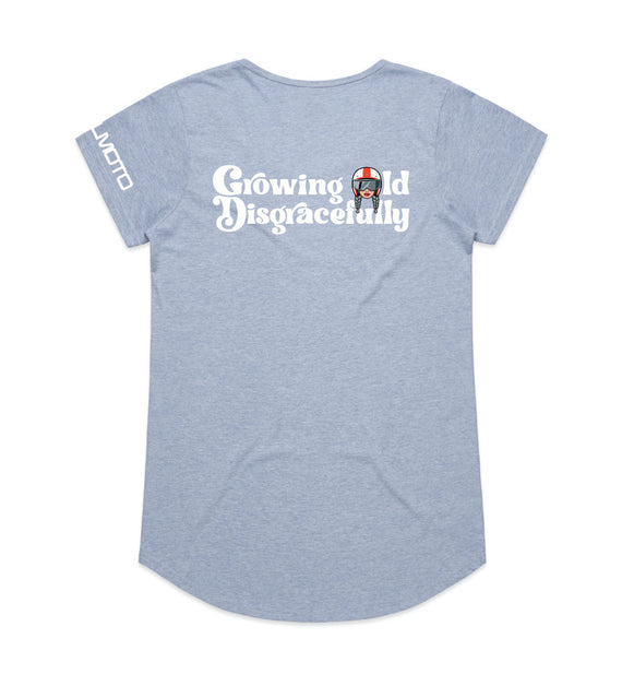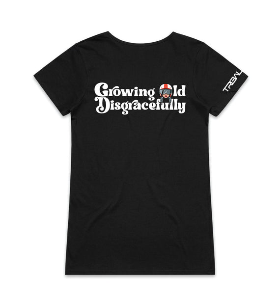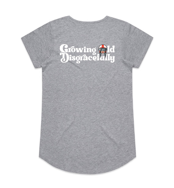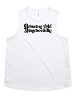 This striking design includes the words Growing Old Disgracefully with a lady in a motorcycle helmet with grey plaits. Comes in 2 options, helmet only, or helmet and devil horns and a tail. Design is available on a variety of products, including: singlets / tanks, tees (v-neck/scoop neck - round neck), long sleeved tees / sweatshirts / hoodies, tote bags and stickers/decals.