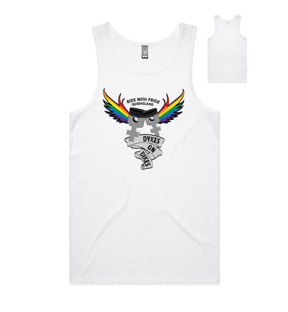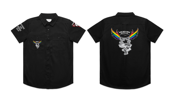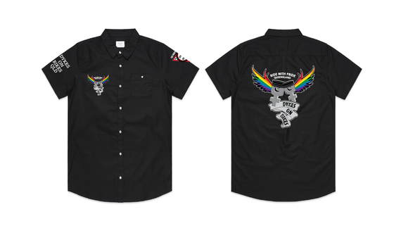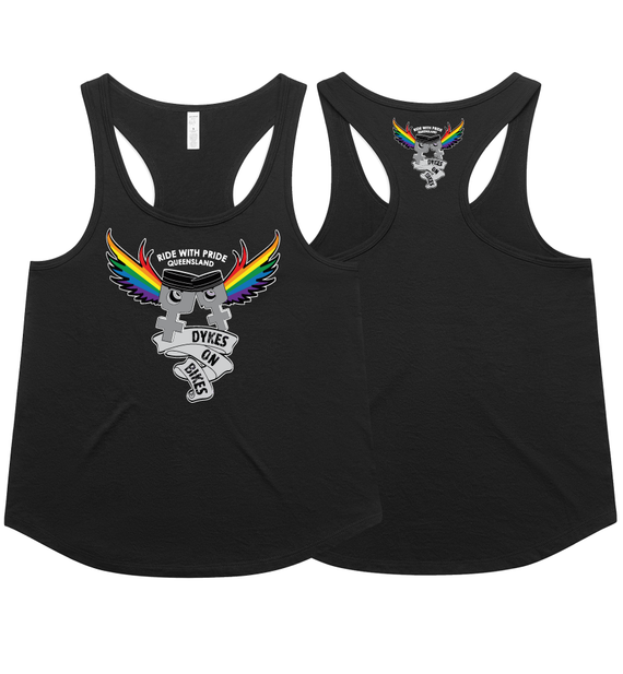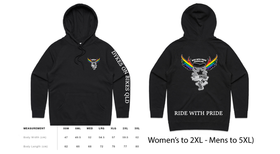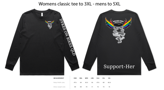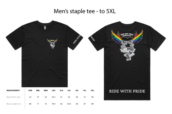Dykes on Bikes Ride with Pride design is available on a variety of garment types and include a front pocket logo, large back logo, the words RIDE WITH PRIDE along the bottom and for long sleeved tees, the words Dykes on Bikes Qld down the left sleeve.