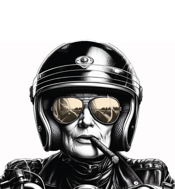 This all occasion, female inspired greeting card includes an image of an older lady motorbike rider smoking a cigarette is great for any occasion. Help tell your loved ones exactly how you feel. Blank inside, so you can add your own personal message inside this card. Comes with envelope.