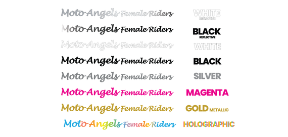This Moto Angels in words cut out decal is available in two sizes and in reflective and non reflective vinyl. Comes with transfer tape and instructions.
