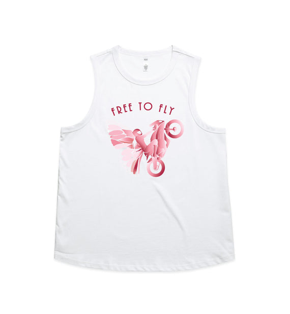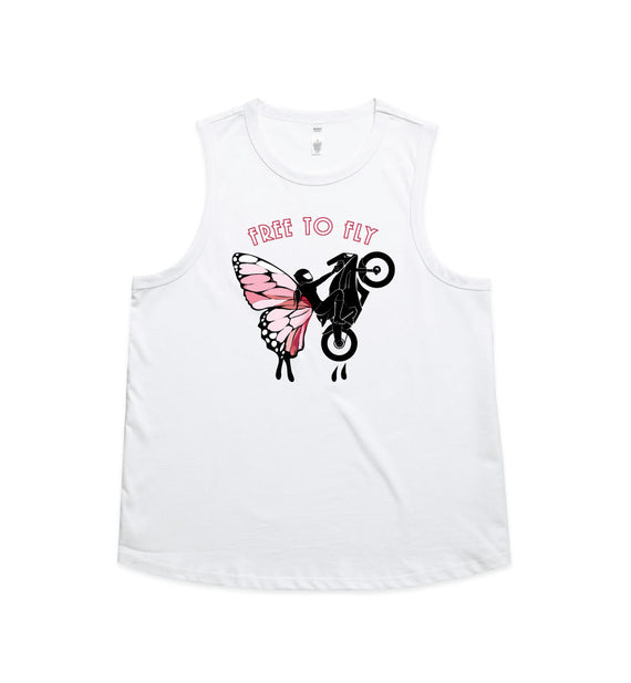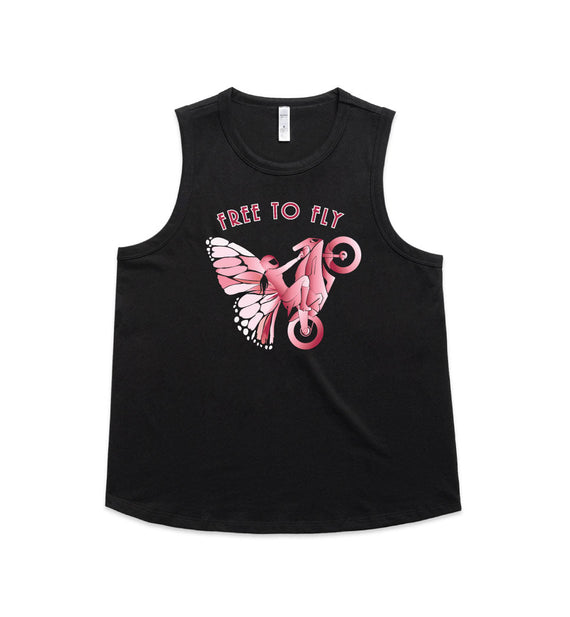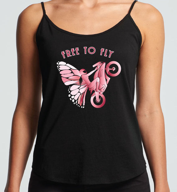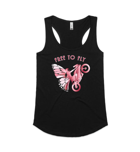 Ride in style with a vibrant print featuring a woman pulling a wheelie, propelled by butterfly wings. Choose between a pink or black rider and a variety of styles including string singlets, racerback tanks, scoop necks, v-necks, and cozy hoodies. Don't forget to grab a matching tote bag and sticker too!