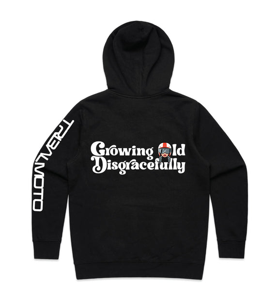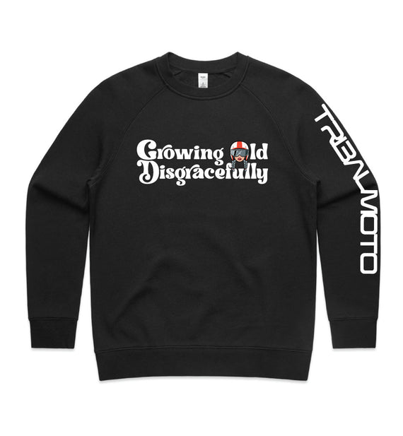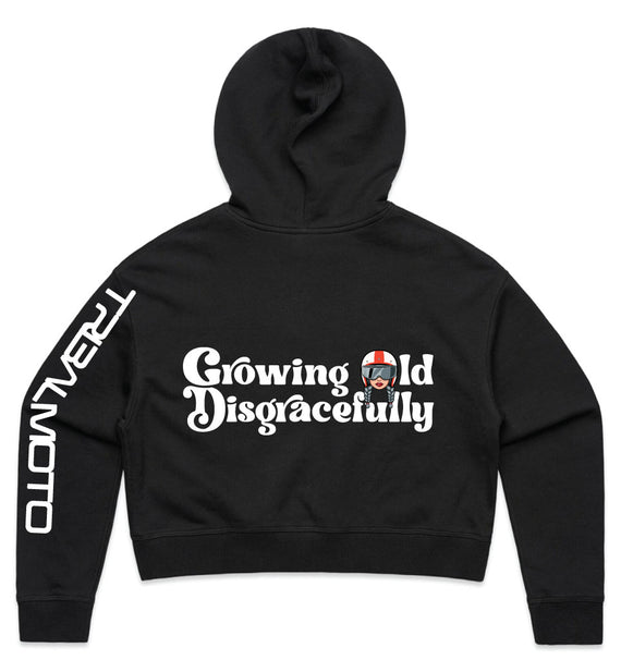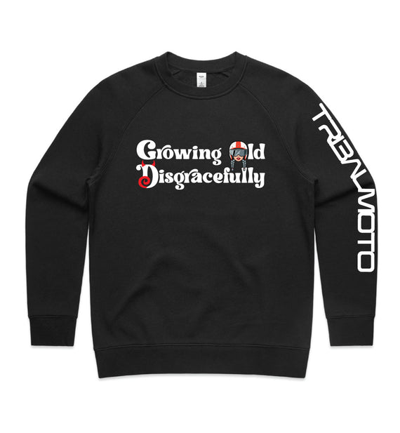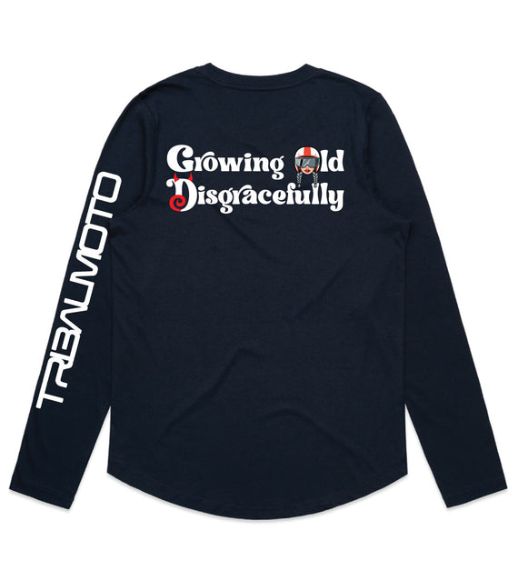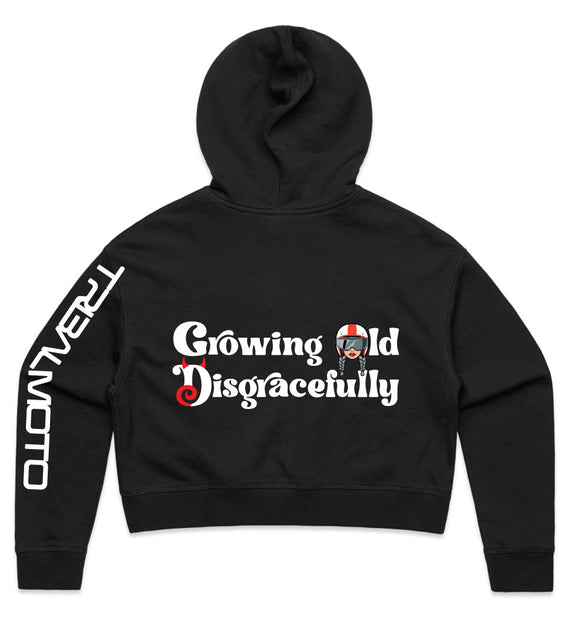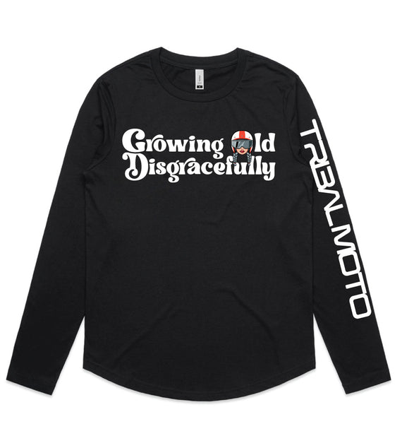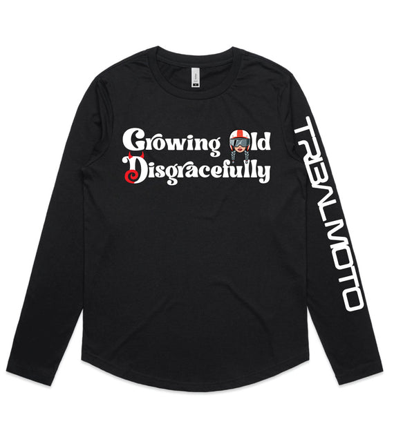 This sassy design includes the words Growing Old Disgracefully with a lady in a motorcycle helmet with grey plaits. Comes in 2 options, helmet only, or helmet and devil horns and a tail. Looks great on garments, as a decal or on a tote!