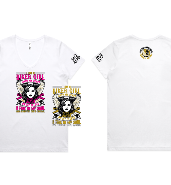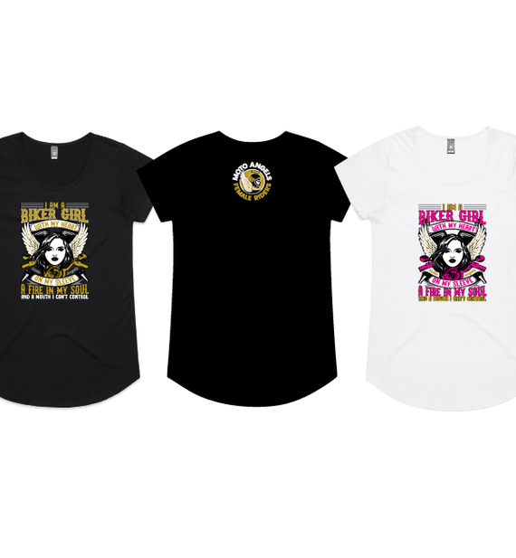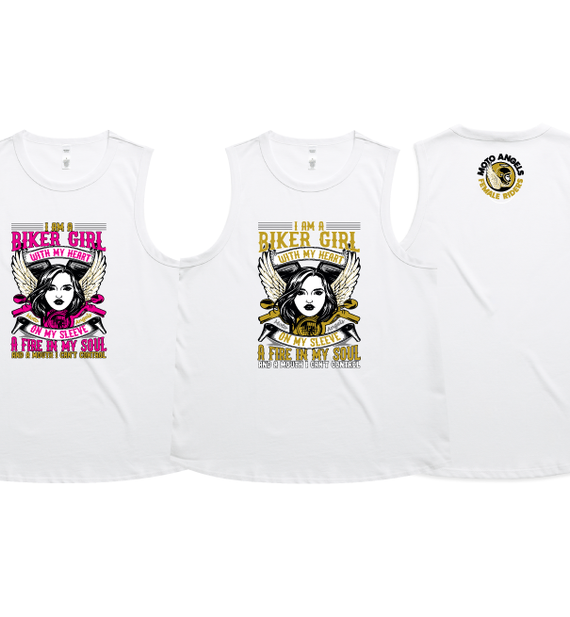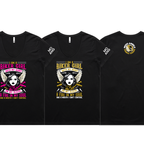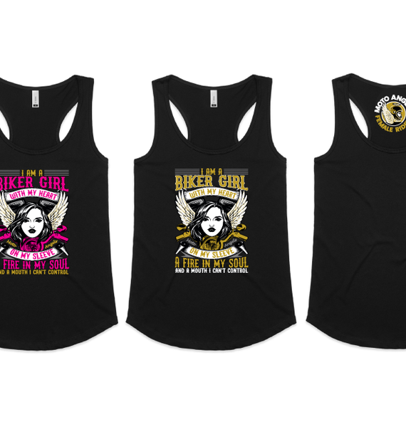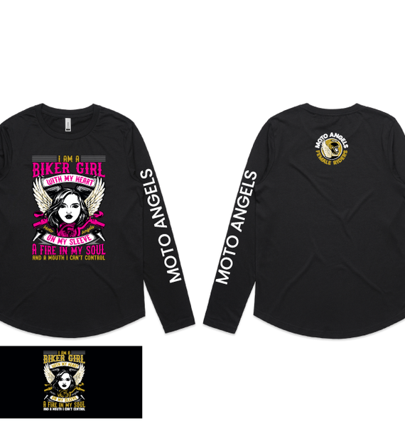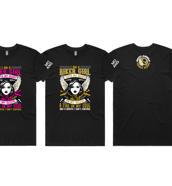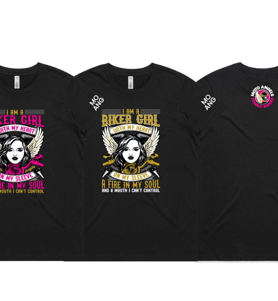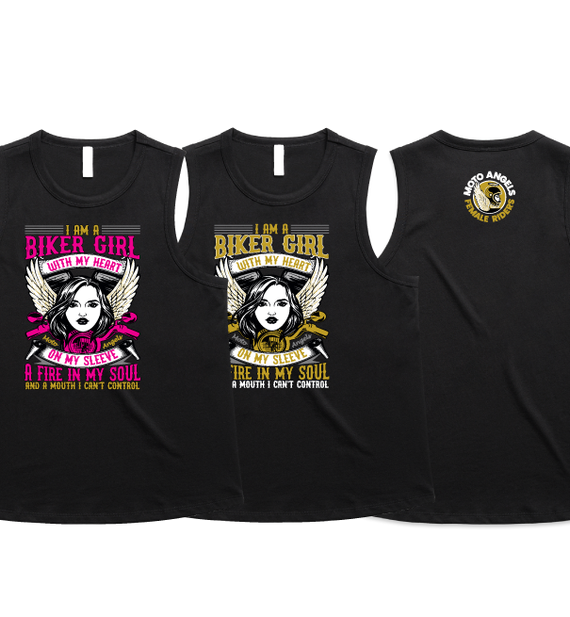 This Moto Angels design is of a lady with the words I am a biker girl with my heart on my sleeve a fire in my soul and a mouth I cant control.