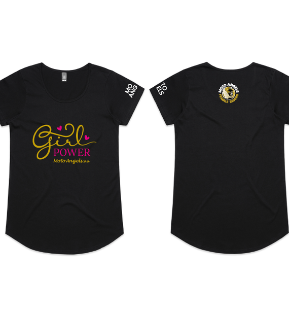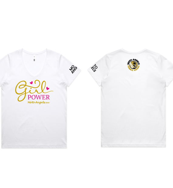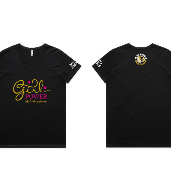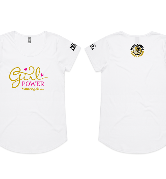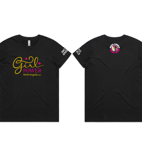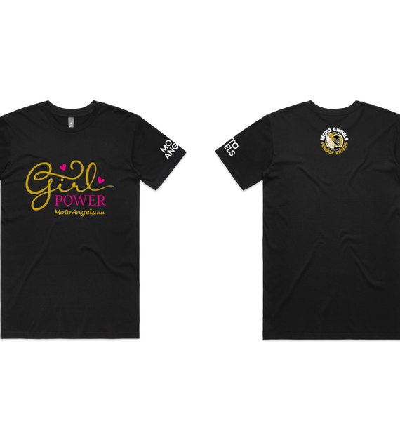 This design of a the words Girl Power in gold and pink. Comes in a variety of garment types and colours, with placement on the front or back available.