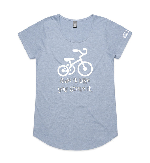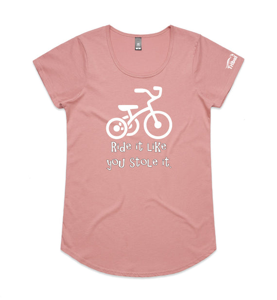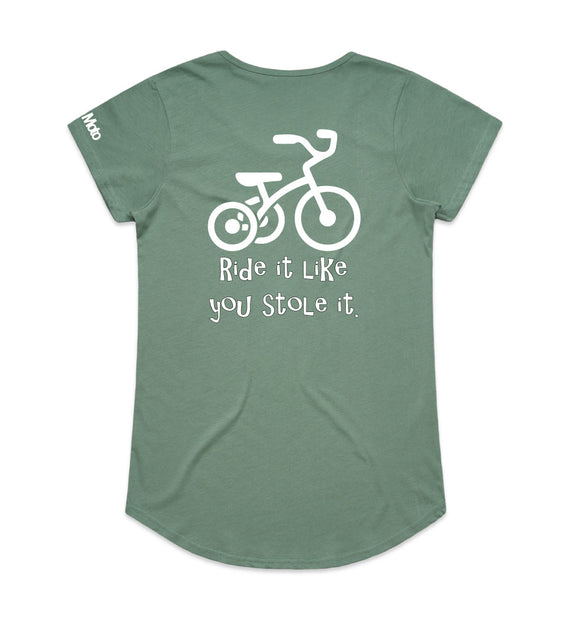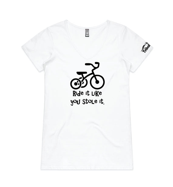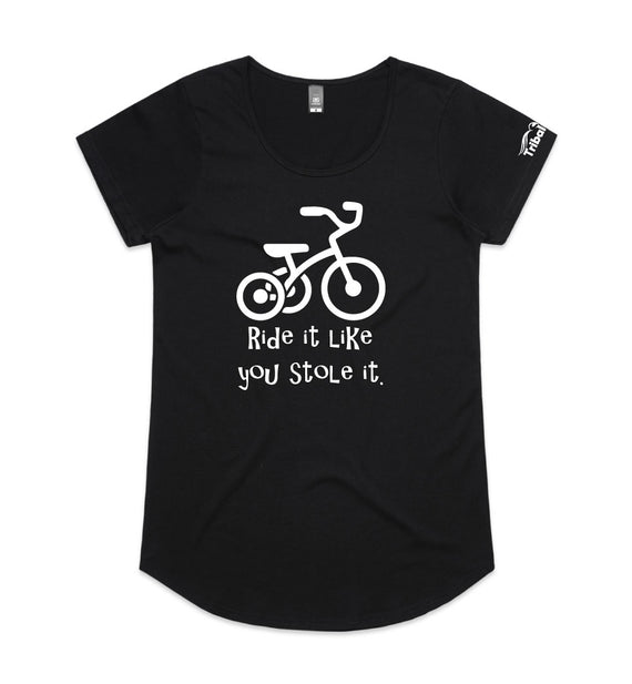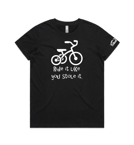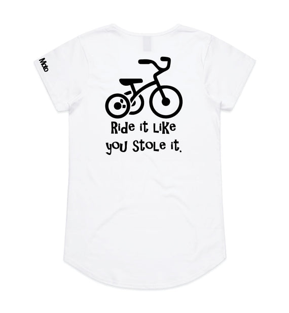 Ride it like you stole it design. If you're looking for something understated, this is it. It really pops and looks great on white, but looks cool and eerie on black and even cooler as a decal or on a tote!