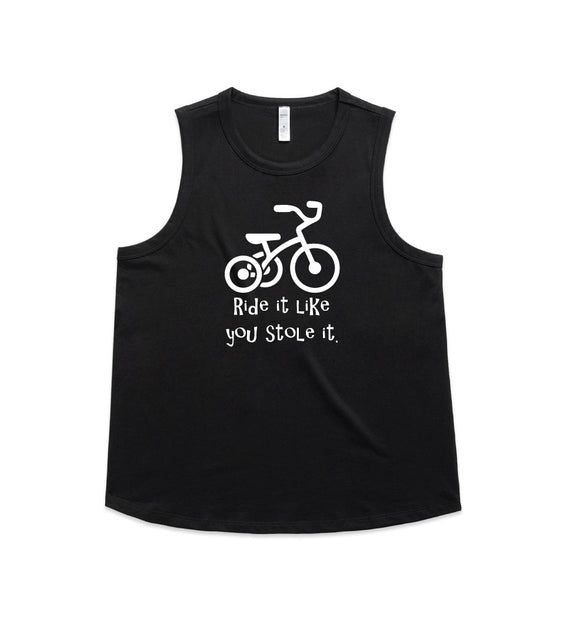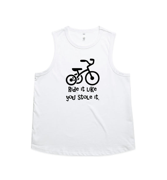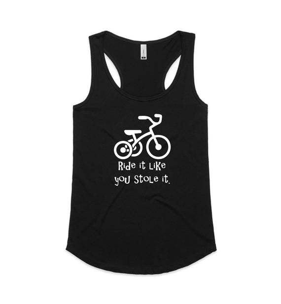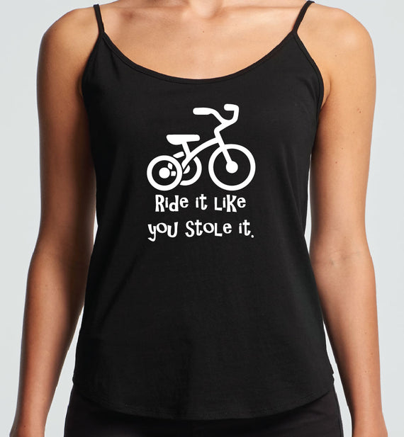 Ride it like you stole it design. Available in string singlets, racerback tanks, scoop necks, v-necks, sweaters and cozy hoodies. Don't forget to grab a matching tote bag and sticker too!