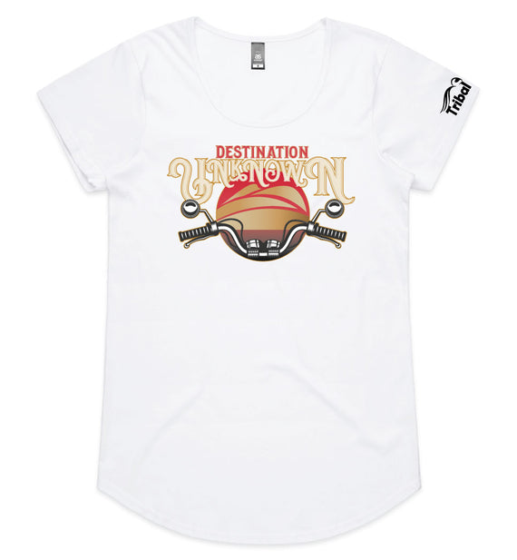 This design is of motorbike handlebars in front of a sunset with the words destination unknown. If you're looking for something understated, this is it. It really pops and looks great on white, but looks cool and eerie on black and even cooler as a decal or on a tote!