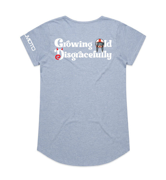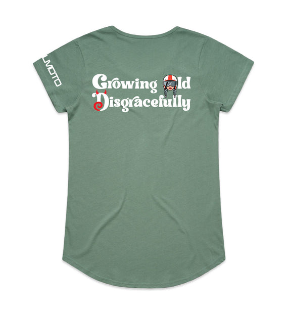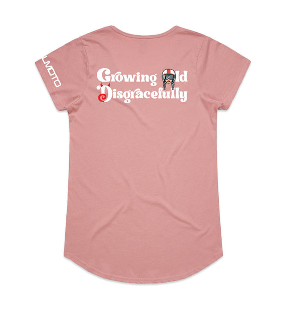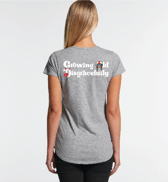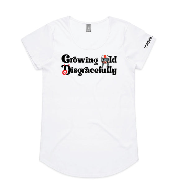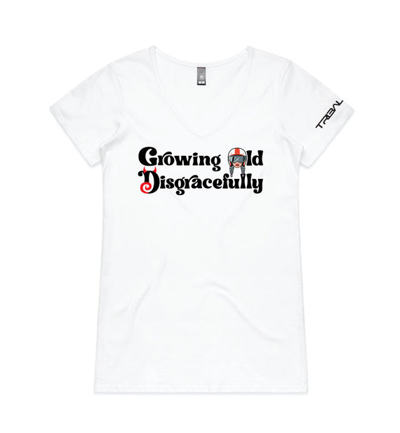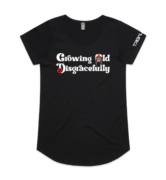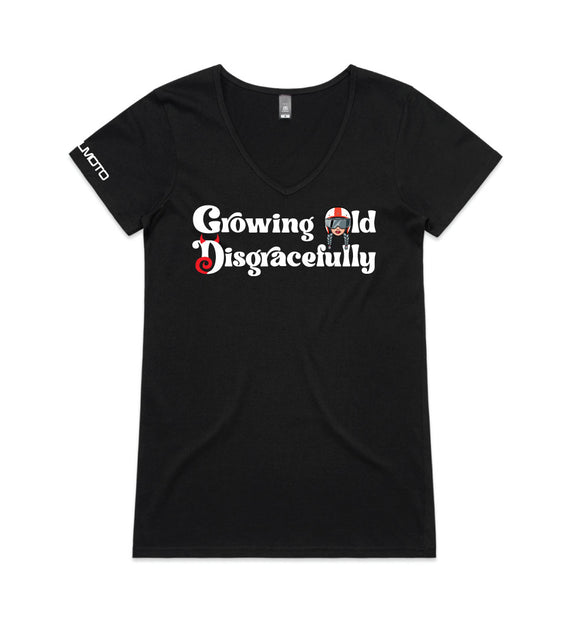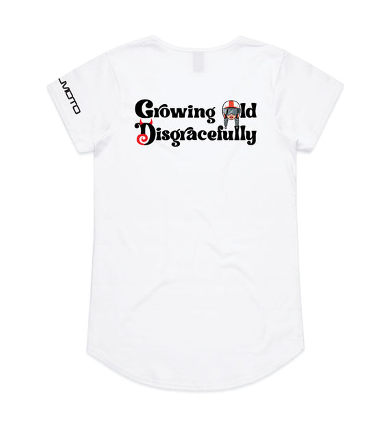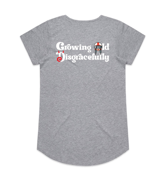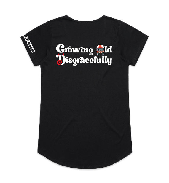 This sassy design includes the words Growing Old Disgracefully with a lady in a motorcycle helmet with grey plaits. Comes in 2 options, helmet only, or helmet and devil horns and a tail. Design is available on a variety of products, including: singlets / tanks, tees (v-neck/scoop neck - round neck), long sleeved tees / sweatshirts / hoodies, tote bags and stickers/decals.