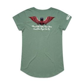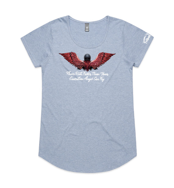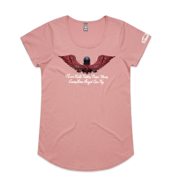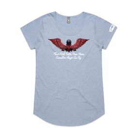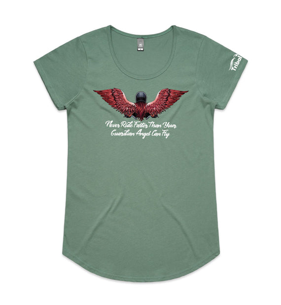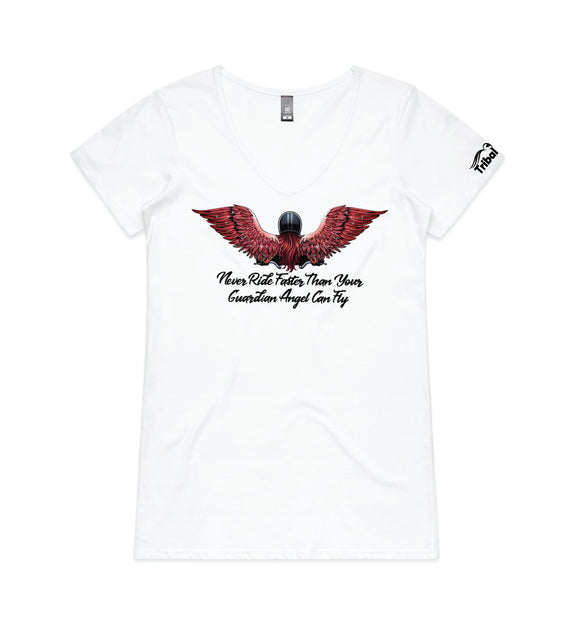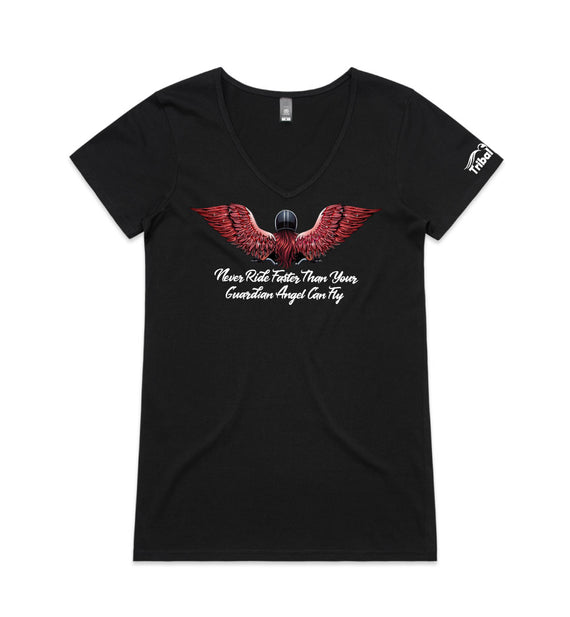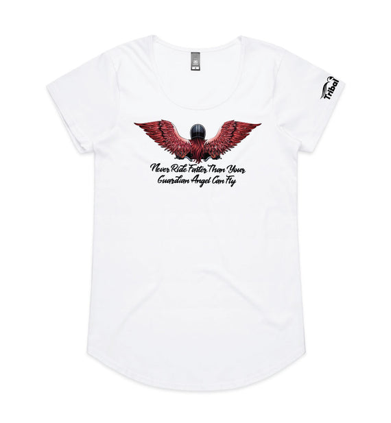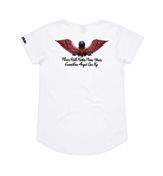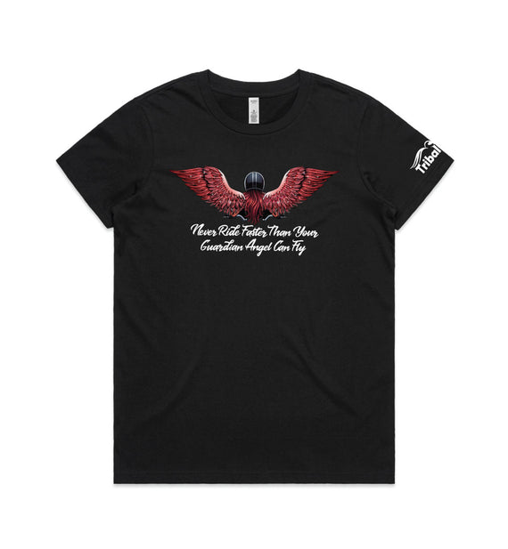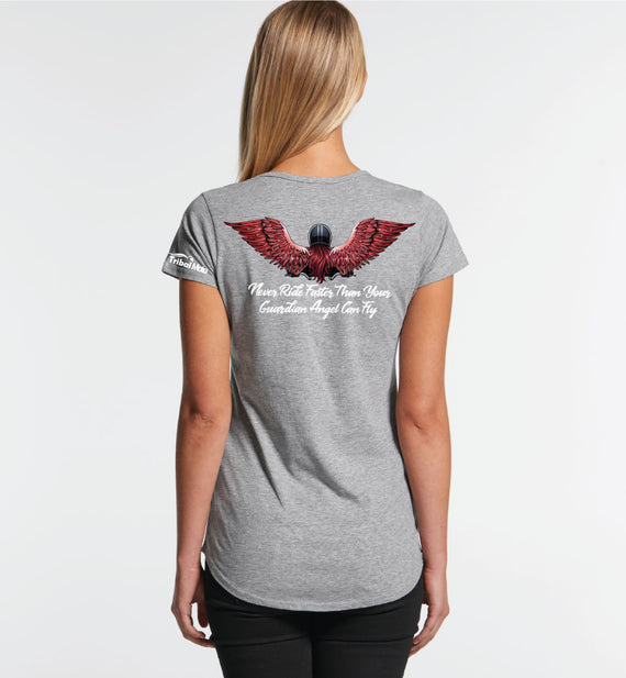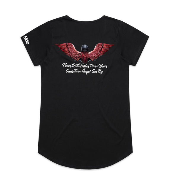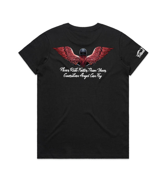 This striking design includes a lady motorbike rider wearing a helmet, with long red hair and gorgeous angel wings. Under her are the words Never ride faster than your guardian angel. Design is available on a variety of products, including: singlets / tanks, tees (v-neck/scoop neck - round neck), long sleeved tees / sweatshirts / hoodies, tote bags and stickers/decals.