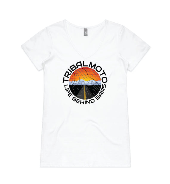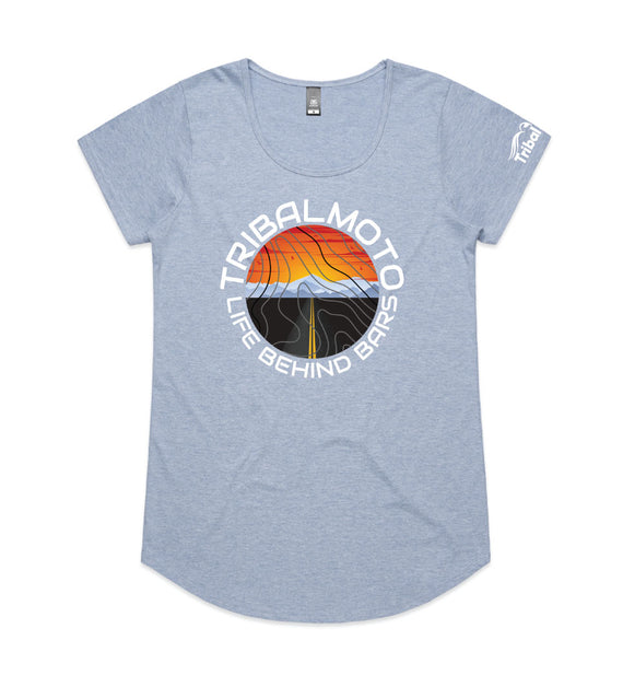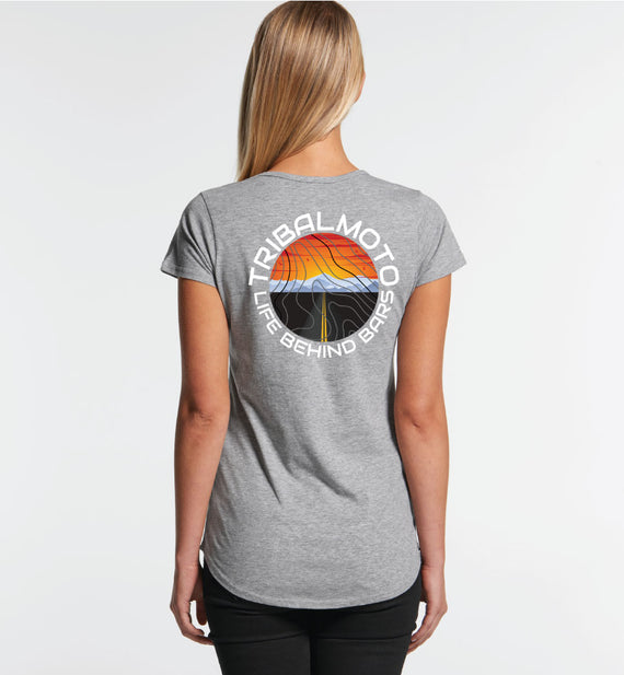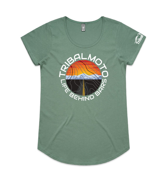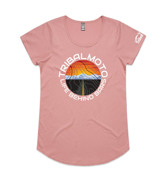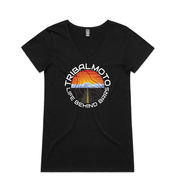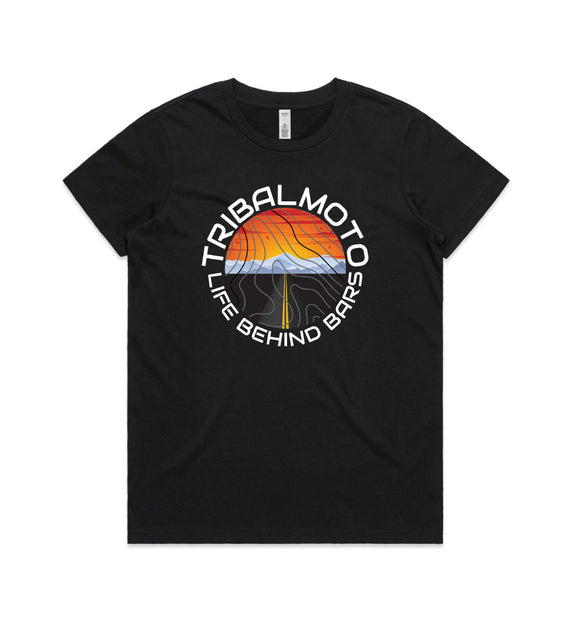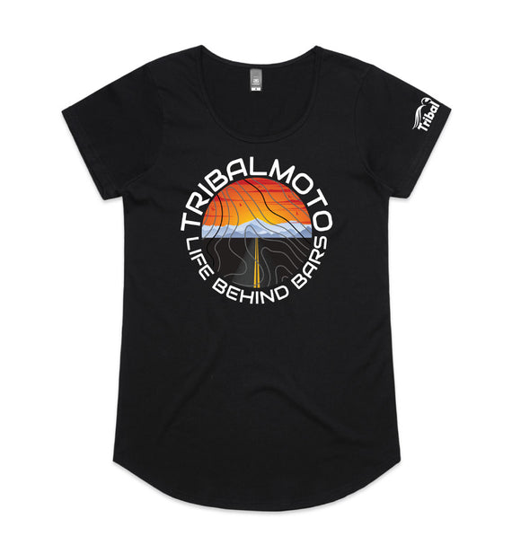 This circle design includes the words TribalMoto and Life Behind Bars around a circle with a sunset, mountains and a road, covered with topographical lines. Available in a variety of styles including string singlets, racerback tanks, scoop necks, v-necks, sweatshirts and cozy hoodies. Don't forget to grab a matching tote bag and sticker too!
