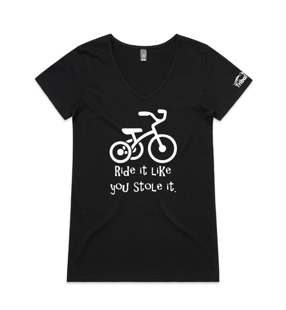 Ride it like you stole it design. If you're looking for something understated, this is it. It really pops and looks great on white, but looks cool and eerie on black and even cooler as a decal or on a tote!