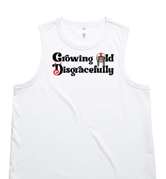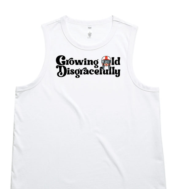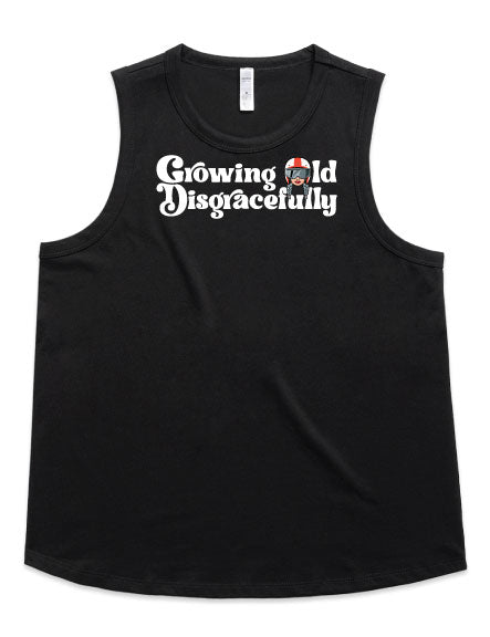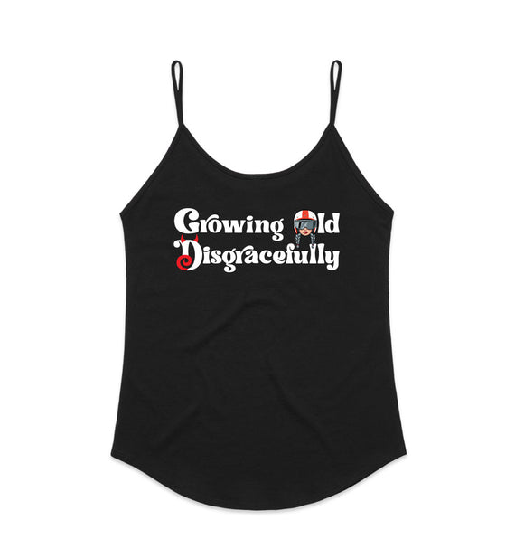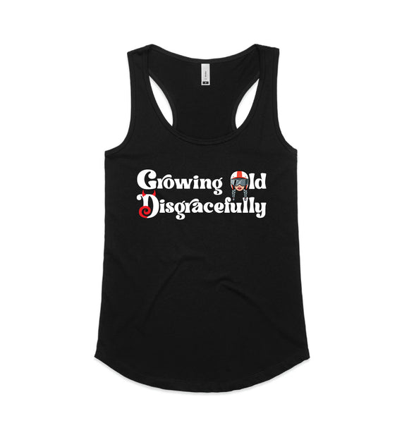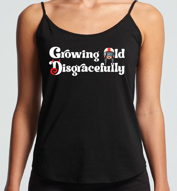 This sassy design includes the words Growing Old Disgracefully with a lady in a motorcycle helmet with grey plaits. Comes in 2 options, helmet only, or helmet and devil horns and a tail.  Available in string singlets, racerback tanks, scoop necks, v-necks, sweaters and cozy hoodies. Don't forget to grab a matching tote bag and sticker too!