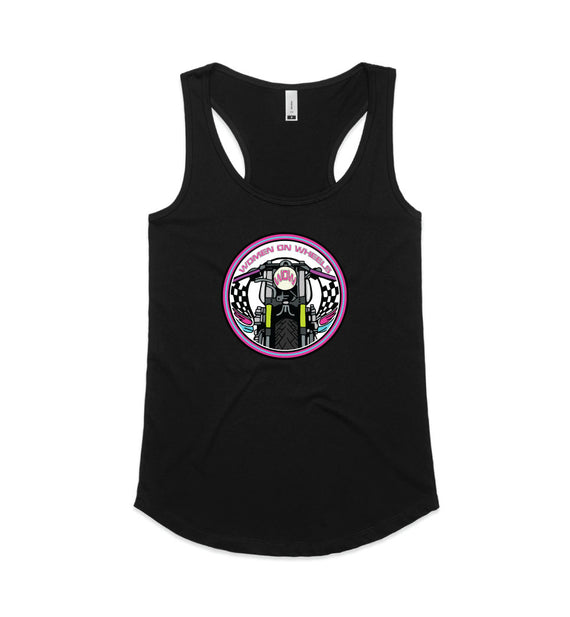 This ladies black racer back tank includes a front large logo and a small back WOW logo.