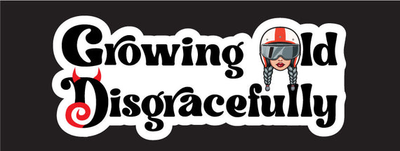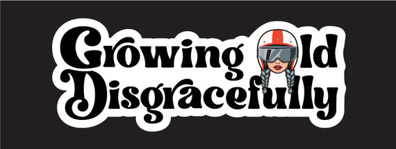 This sassy design includes the words Growing Old Disgracefully with a lady in a motorcycle helmet with grey plaits. Comes in 2 options, helmet only, or helmet and devil horns and a tail. Available in a variety of sizes.