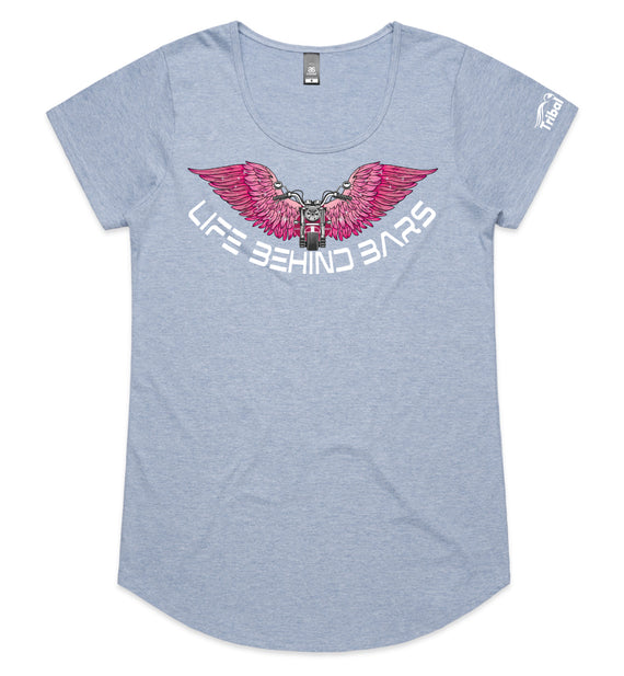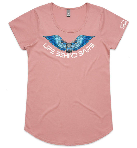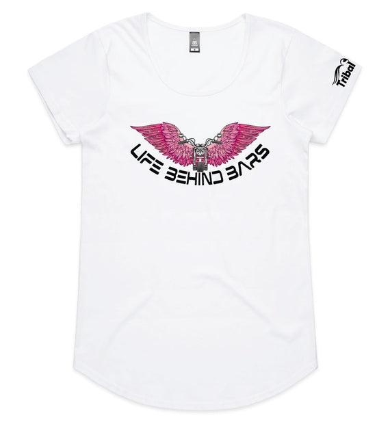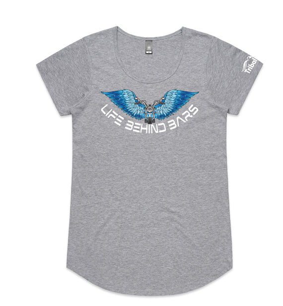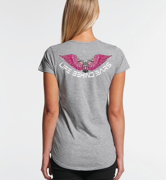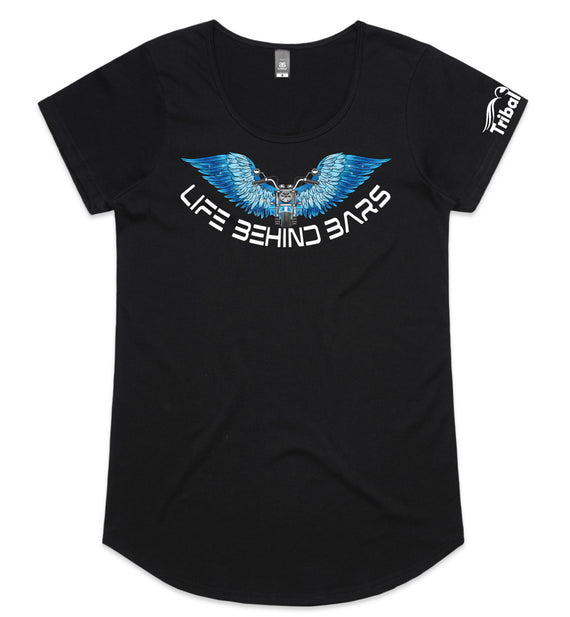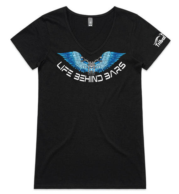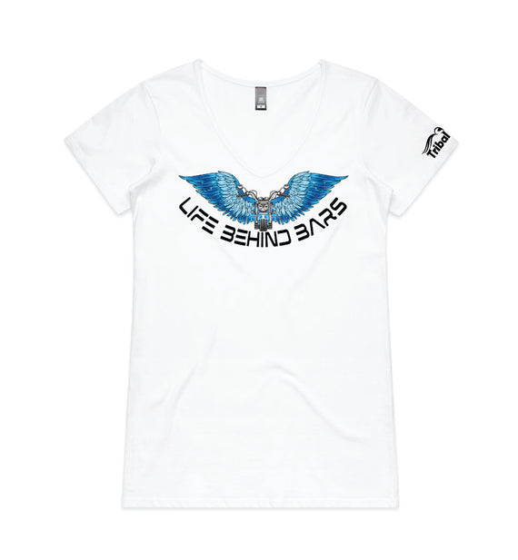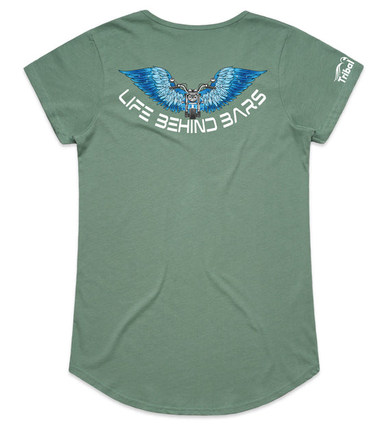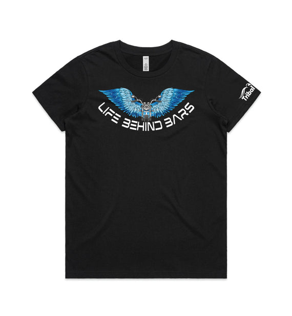 This stunning design includes a motorbike in front of open wings and the words Life Behind Bars across the bottom.
