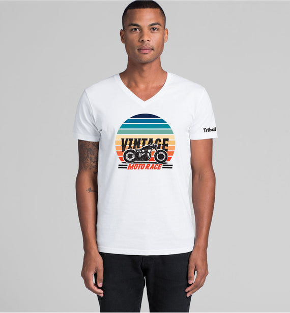 This design is available in a round neck tee, v-neck tee, long-sleeved tee, and hoodie with a zip. Long sleeves in this design have TRIBALMOTO down the arm and the letters TM on the chest.