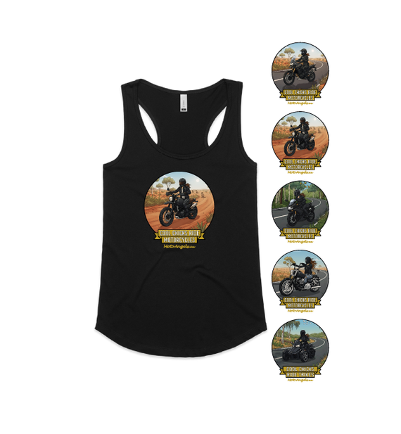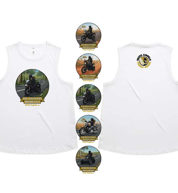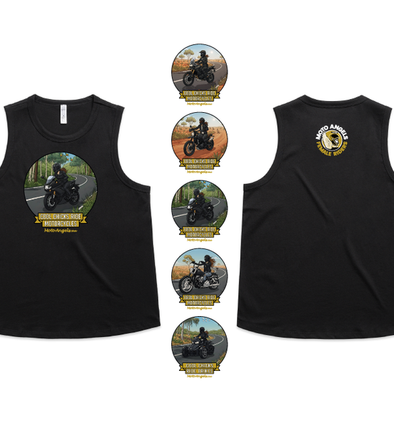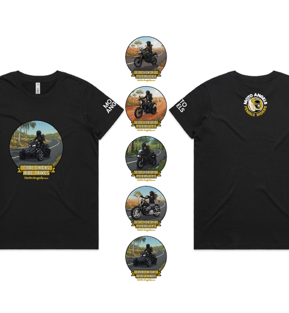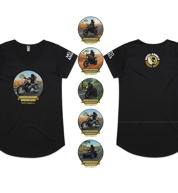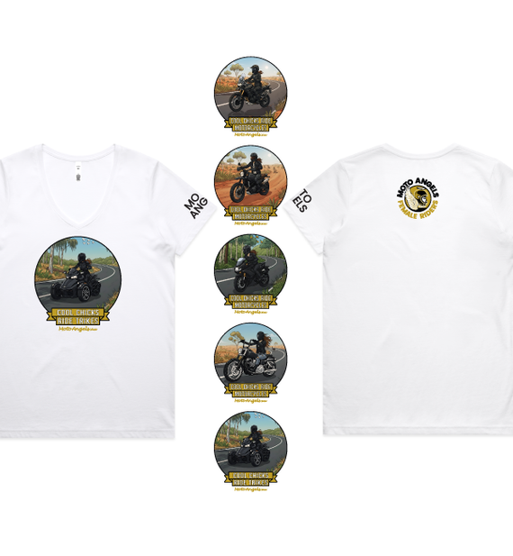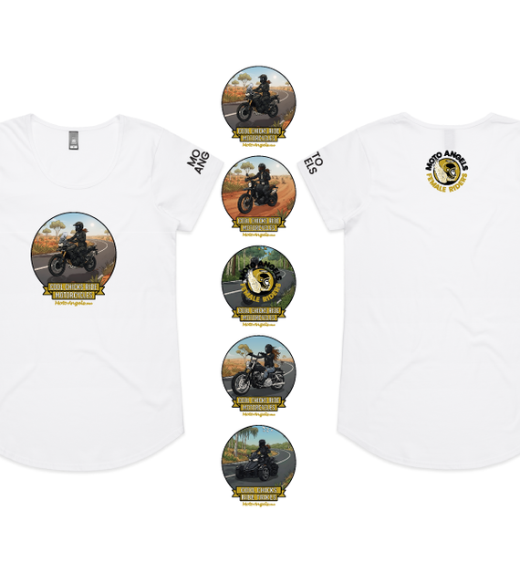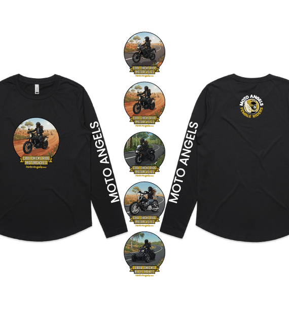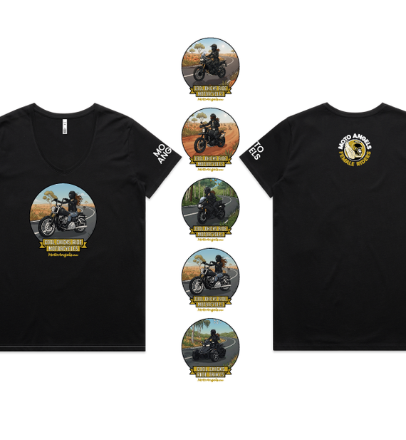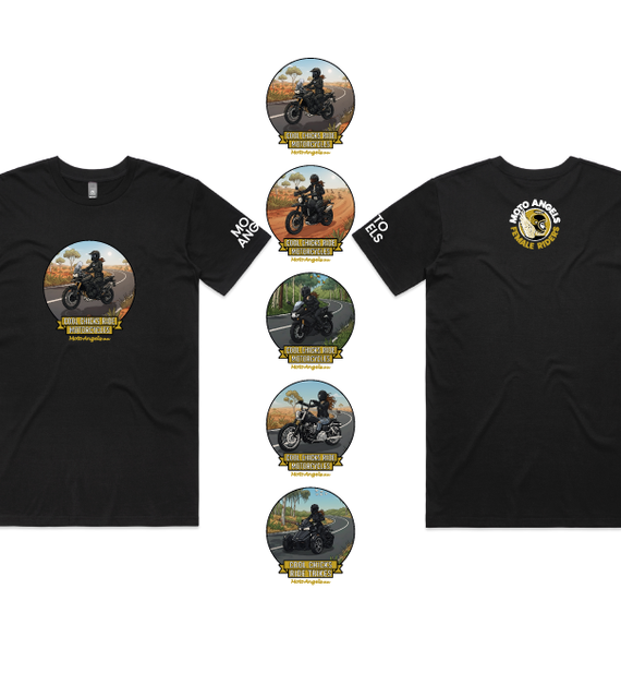 Moto Angels design of a female rider riding five styles of motorbike. Design placed on the front with a small Moto Angels logo will be placed on the back. Available on a variety of garment styles and colours.