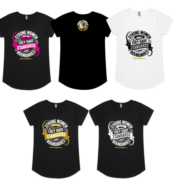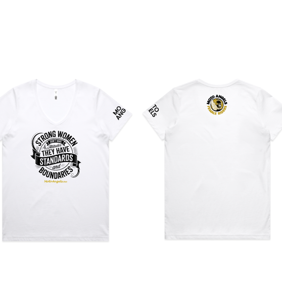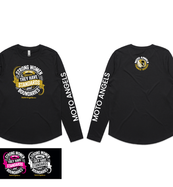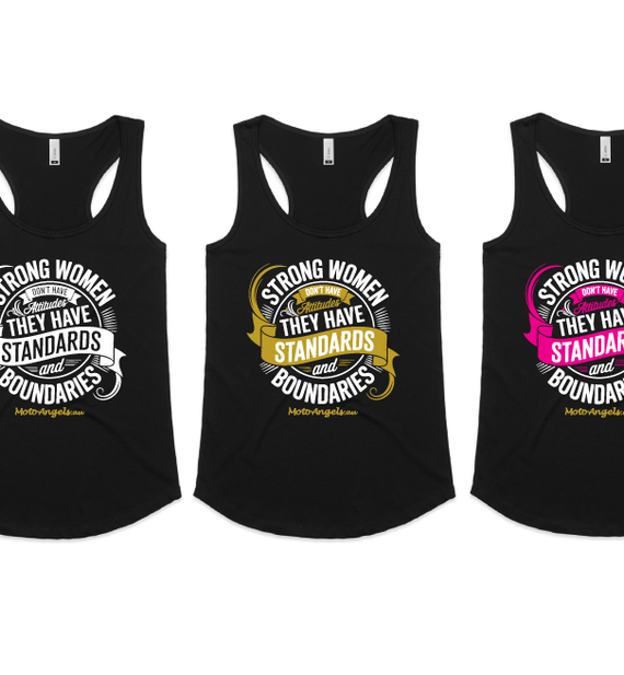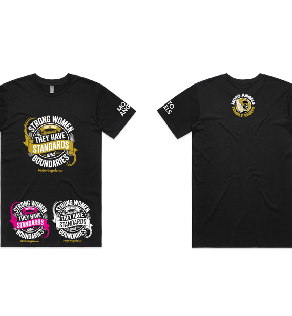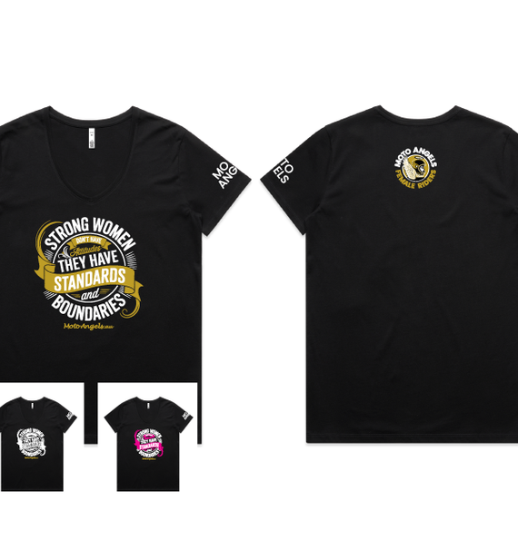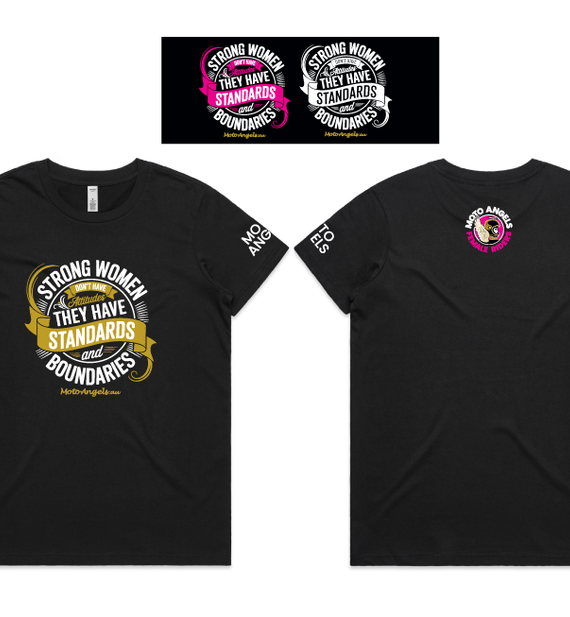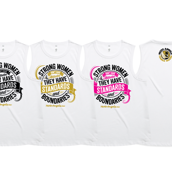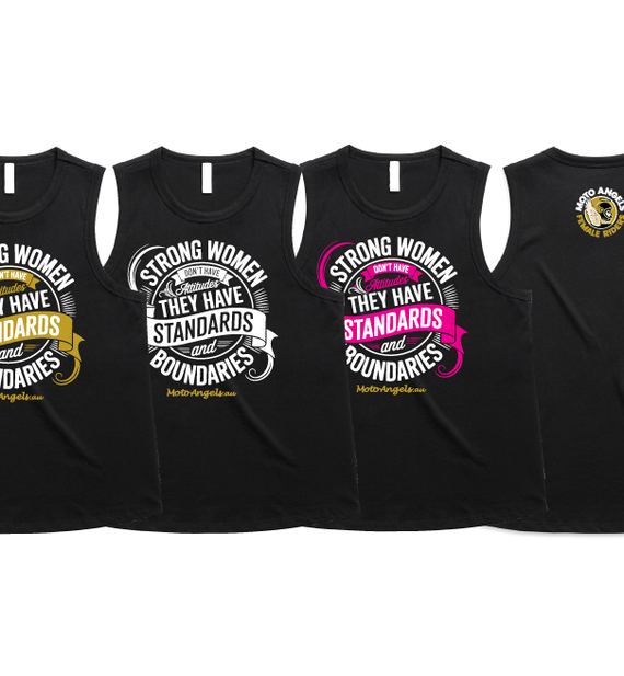 Moto Angels designs of the words Strong women don't have attitudes, they have standards and boundaries. With the words Moto Angels.au underneath.