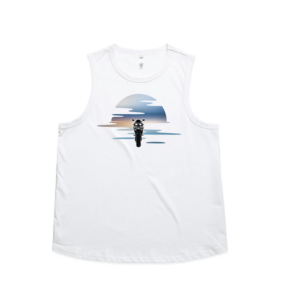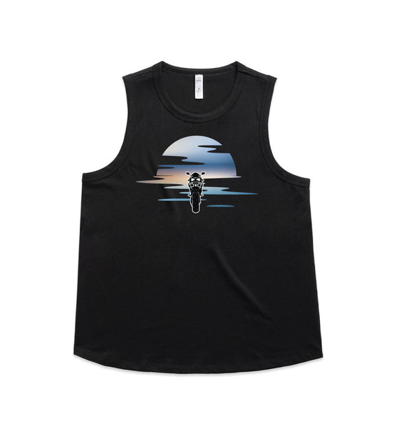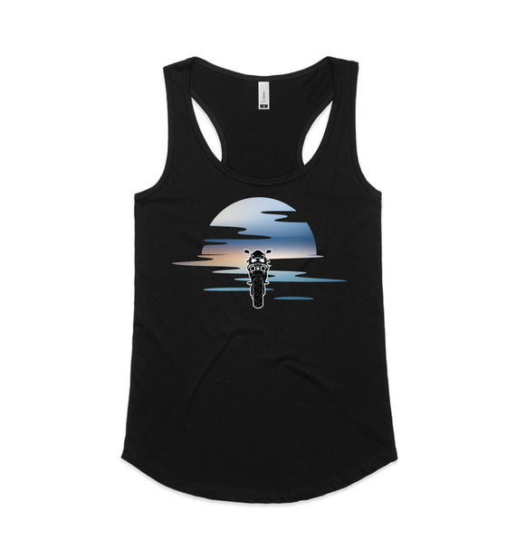This design is of a motorbike in front of a beautiful sunset. It really pops and looks great on a tee, hoodie, note pad or bumper sticker. Available in string singlets, racerback tanks, scoop necks, v-necks, sweaters and cozy hoodies. Don't forget to grab a matching tote bag and sticker too!