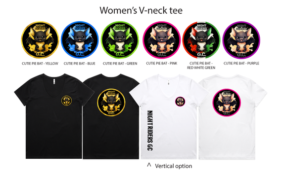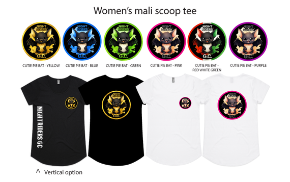 This gorgeous ladies Cutie Pie Bat design comes six colours and in a variety of tees. Includes a pocket logo on the front and large back design of the colour chosen.
